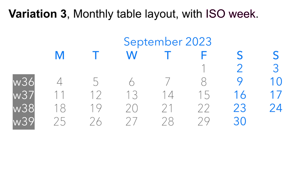 - Start of Week Monday with ISO week number (2023, 2024, 2025)