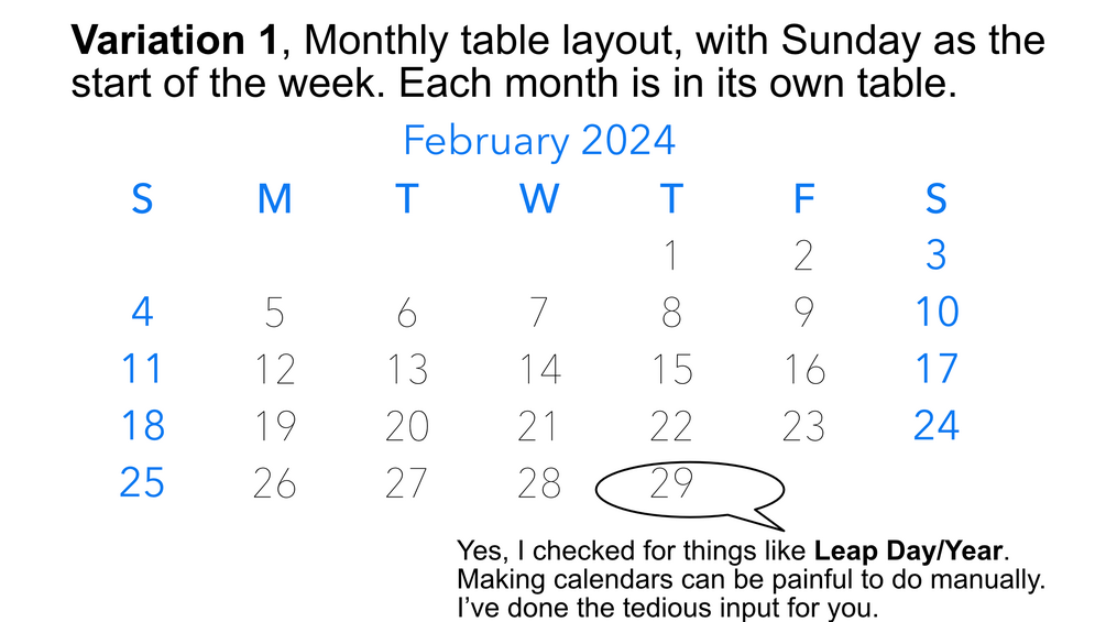 In the process of designing a planner, I had to enter multiple calendars into tables. Rather than waste that menial work, I've listed it here for you. It's just correctly input monthly calendars in table format, for Affinity Publisher. It's the raw info that you can then place and style as needed.