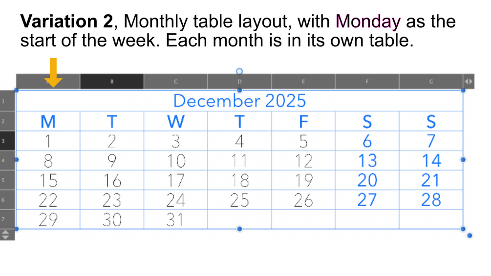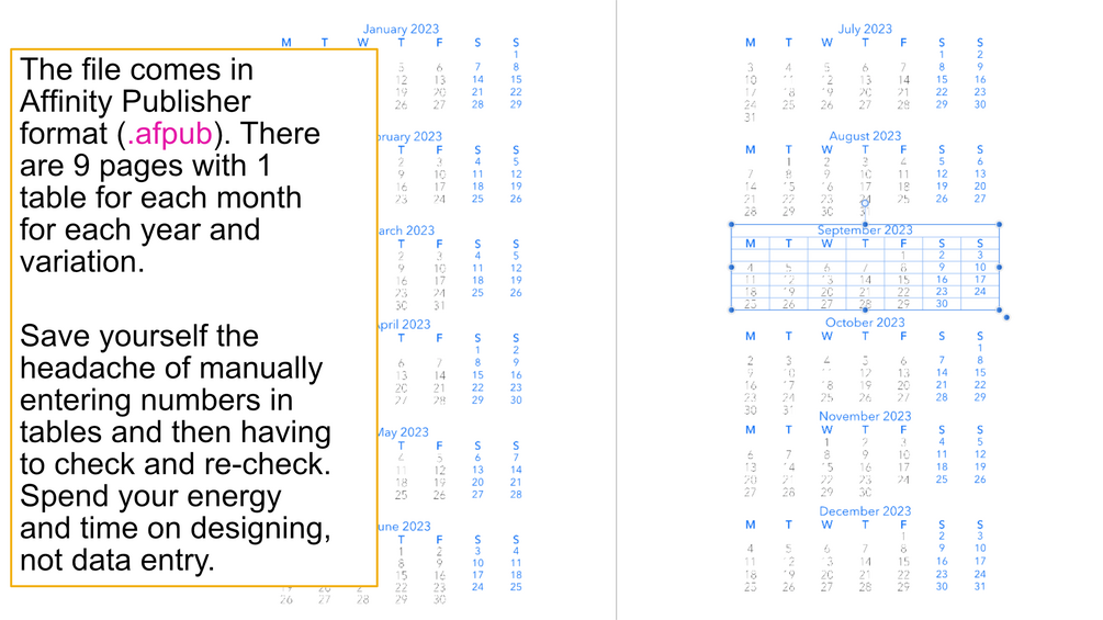 In the process of designing a planner, I had to enter multiple calendars into tables. Rather than waste that menial work, I've listed it here for you. It's just correctly input monthly calendars in table format, for Affinity Publisher. It's the raw info that you can then place and style as needed.